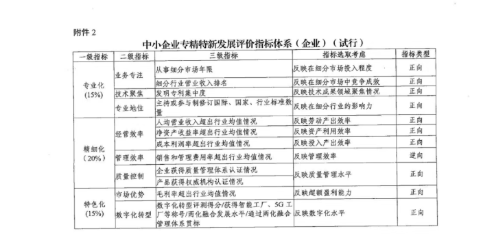 工業(yè)和信息化部辦公廳關(guān)于印發(fā)《中小企業(yè)專精特新發(fā)展評價指標體系(試行)》的通知